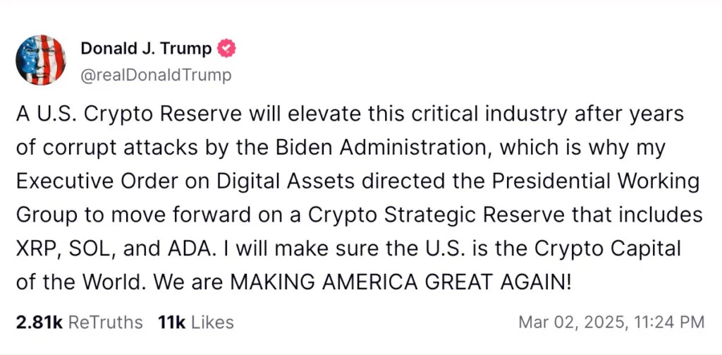 在进入2025 年后,艾达币跌落1 美元。不过,随着美国总统川普在3 月2 日宣布Cardano(ADA)成为历史性加密储备的五种加密货币之一后,其价格在2 日晚间飙升,在一小时内上涨了50%,在短短24 小时内就出现了惊人的70% 的涨幅。