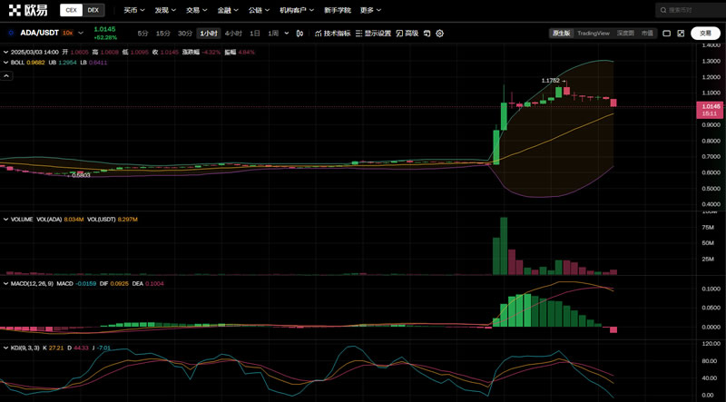 ADA 币推出时价格仅为0.024 美元,然而,截止目前,该代币的交易价格为1.1303 美元(换算为新台币为36.46 元),在过去24 小时上涨了71.00%,在过去7 天上涨了47.41%。