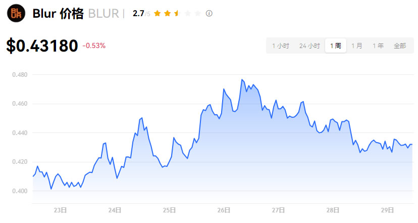 截止5 月28 日,BLUR 的交易价格为$0.4292,在过去24 小时下跌了3.48%,距其价格高点仍有99% 的距离。
