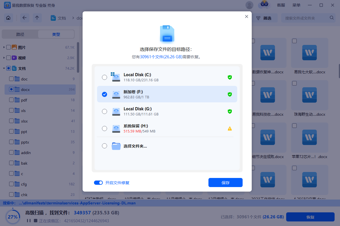 步骤4.选中需要恢复的文件数据后,点击“恢复”,选择需要保存的位置(注意不要保存到源盘D盘,避免数据被覆盖),并“开启文件修复”(软件在保存过程中恢复自动修复损坏的文件),随后点击“保存”。