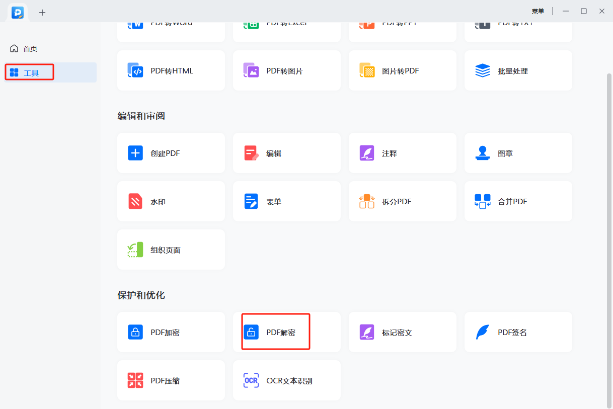 步骤1. 打开运行易我PDF编辑器(EaseUS PDF Editor),在首页点击【打开】,或者点击【编辑】,也可以点击左侧【工具】-【PDF解密】,然后选择需要进行编辑解密的文件到易我PDF编辑器里。