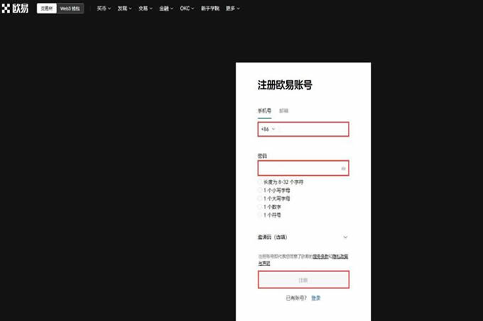 1.在进行交易之前,需要进行账号注册,打开欧易官网,点击首页右上角【注册】进入注册页面