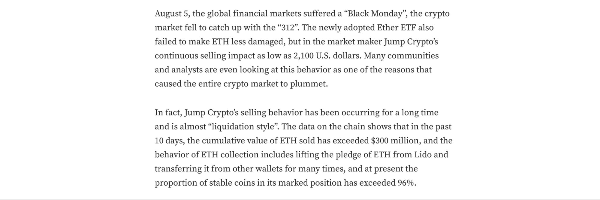 - 2024年8月:在全球金融市场遭遇"黑色星期一"时,Jump Crypto展开大规模抛售,主要集中在以太坊(ETH)上。数据显示,Jump领县进行抛售ETH超过3亿美元,且包括从Lido解除质押的资产。此举被视为加密市场暴跌的原因之一。市场猜测,这一抛售可能与Terra案的44.7亿美元和解款项有关,迫使Jump迅速套现以应对潜在财务压力。
