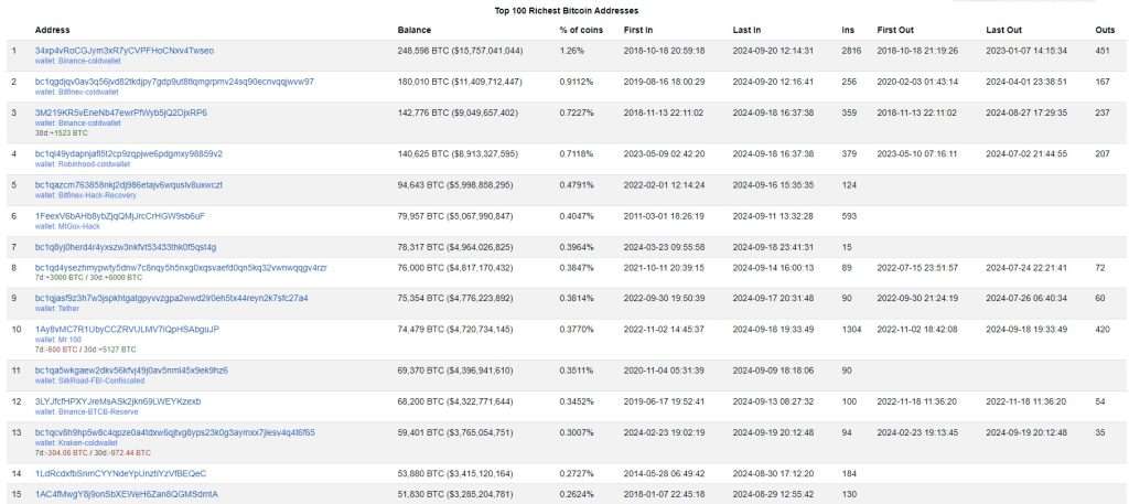 根据Bitinfocharts 网站数据,截止2024 年9 月20 日,持有比特币数量最多的15 个钱包地址如下: