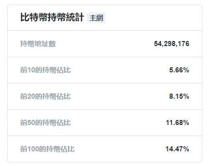 根据CoinCarp 的数据,截止台湾时间9 月20 日,持有比特币的地址接近5500 万,其中前100 的持币数量占据14.47%,接近15%。按目前比特币数量19,756,571 来说,前100 个地址拥有超过 285 万比特币。
