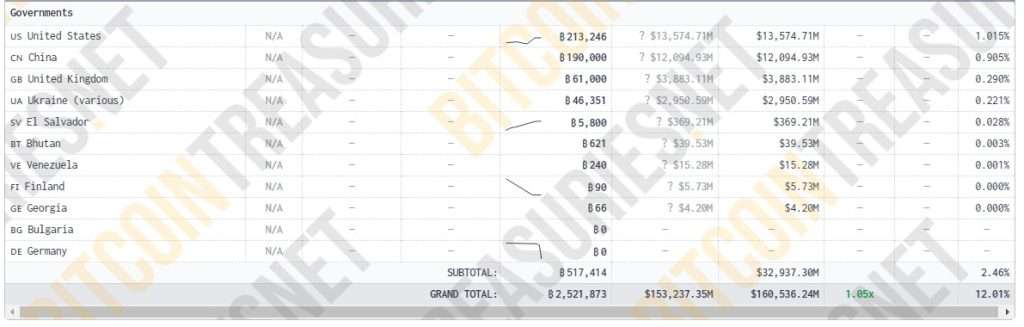- 美国:持有213,246 枚比特币,现值135.7 亿美元