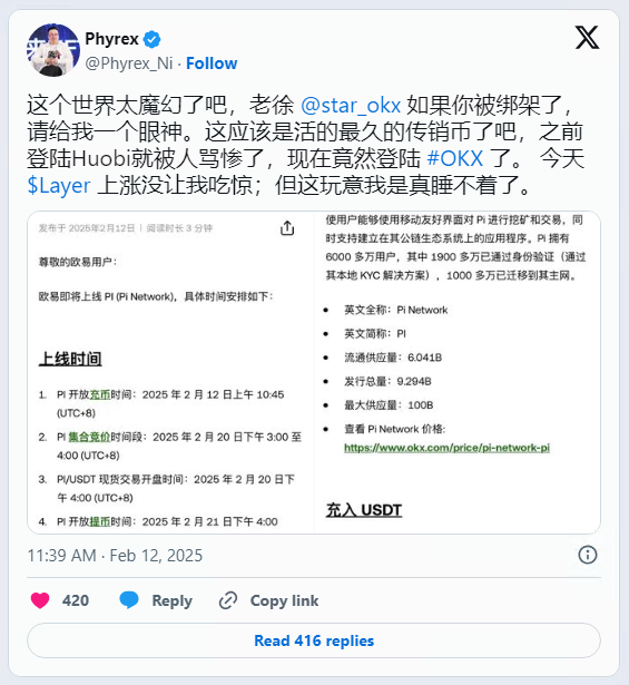 加密货币分析师Phyrex就在社交平台X上发文直呼,「这个世界也太魔幻了吧」,还标记了OKX执行长徐明星表示,「如果你被绑架了,请给我一个眼神」。