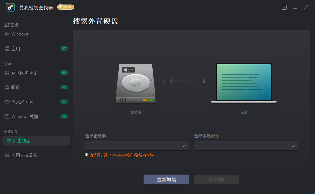 ③ 除了从当前计算机中检索密钥外,它还可以从崩溃的系统磁盘中找到产品密钥或密码。请将崩溃的磁盘连接到正常的计算机,选择驱动器和 Microsoft 帐户,然后单击“扫描”。