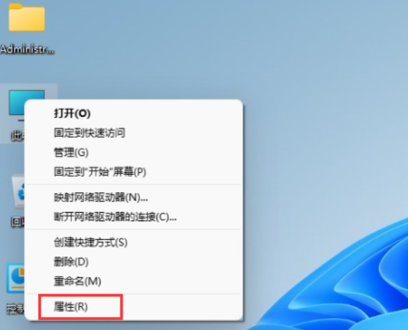 1、首先在win11桌面上右键点击"此电脑",然后点击选择"属性";