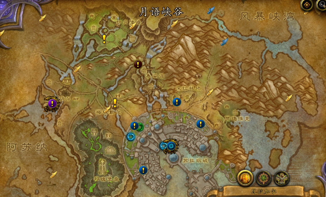 分别是深红林地、法兰纳尔等,就在深红林地的右下位置,那里就是苏拉玛城,暗夜要塞就在这里。