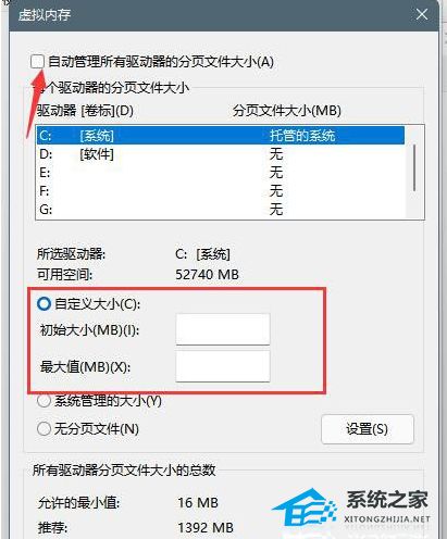 6. 虚拟内存窗口,【取消勾选自动管理所有驱动器的分页文件大小】,然后选择【自定义】,托管的系统选择C盘。