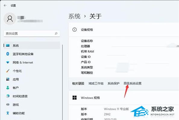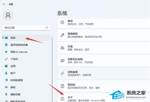 2. 设置窗口,左侧点击【系统】,右侧点击【关于(设备规格,重命名电脑,Windows 规格)】。