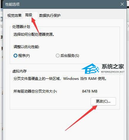 5. 性能选项窗口,切换到【高级】选项卡,然后点击虚拟内存下的【更改】。