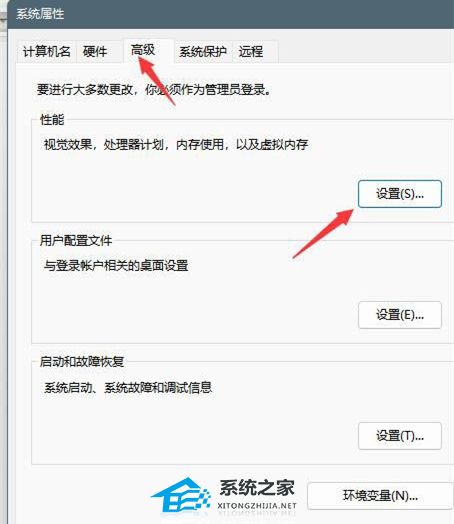 4. 系统属性窗口,切换到【高级】选项卡,然后点击性能(视觉效果,处理器计划,内存使用,以及虚拟内存)下的【设置】。