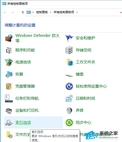 2. 所有控制面板项窗口,切换到【大图标】查看方式,调整计算机的设置下,找到并点击【索引选项(更改 Windows 索引方式以加快搜索速度)】;