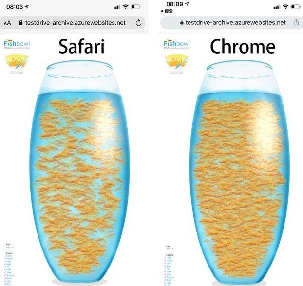 具体步骤,使用手机浏览器打开FishBowl网址,显示后点击Auto或者选择鱼的数量。帧数低于60就会卡顿。以下是散人手机的使用safari、chrome、EDGE、Firefox四个浏览器的测试截图。