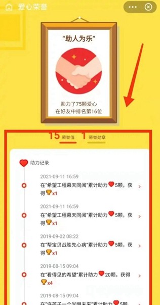 4、然后点击爱心荣誉,这样就可以查看荣誉值了。