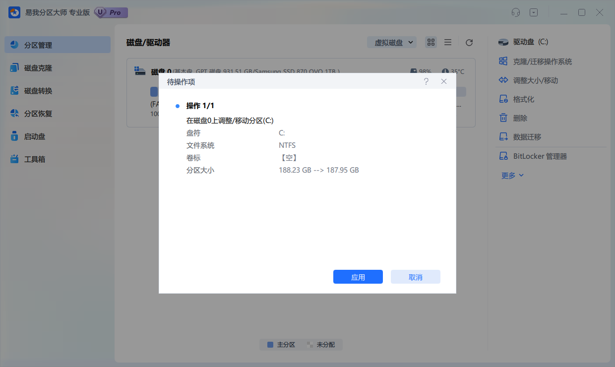 如果你觉得使用磁盘管理工具过于繁琐,也可以考虑一些第三方分区工具。这些工具通常提供更为直观、简易的操作界面,使得分区过程更加友好。如,易我分区大师(EaseUS Partition Master Professional),它的功能涵盖分区创建、删除、调整大小、格式转换等,操作界面简洁,新手也能快速上手。以下,是C盘调整大小的简单图文步骤: