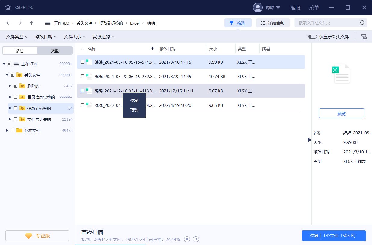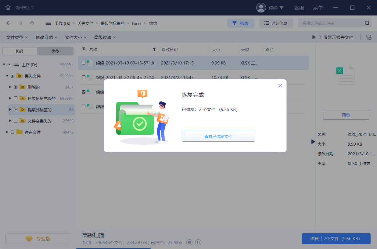 步骤3. 从列表中勾选需要恢复的Excel文件,点击右下角「恢复」按钮,选择文件保存的位置,等待恢复完成即可。切记,不要将需要恢复的Excel文件保存到源盘,请务必保存到其它安全盘或外置盘。