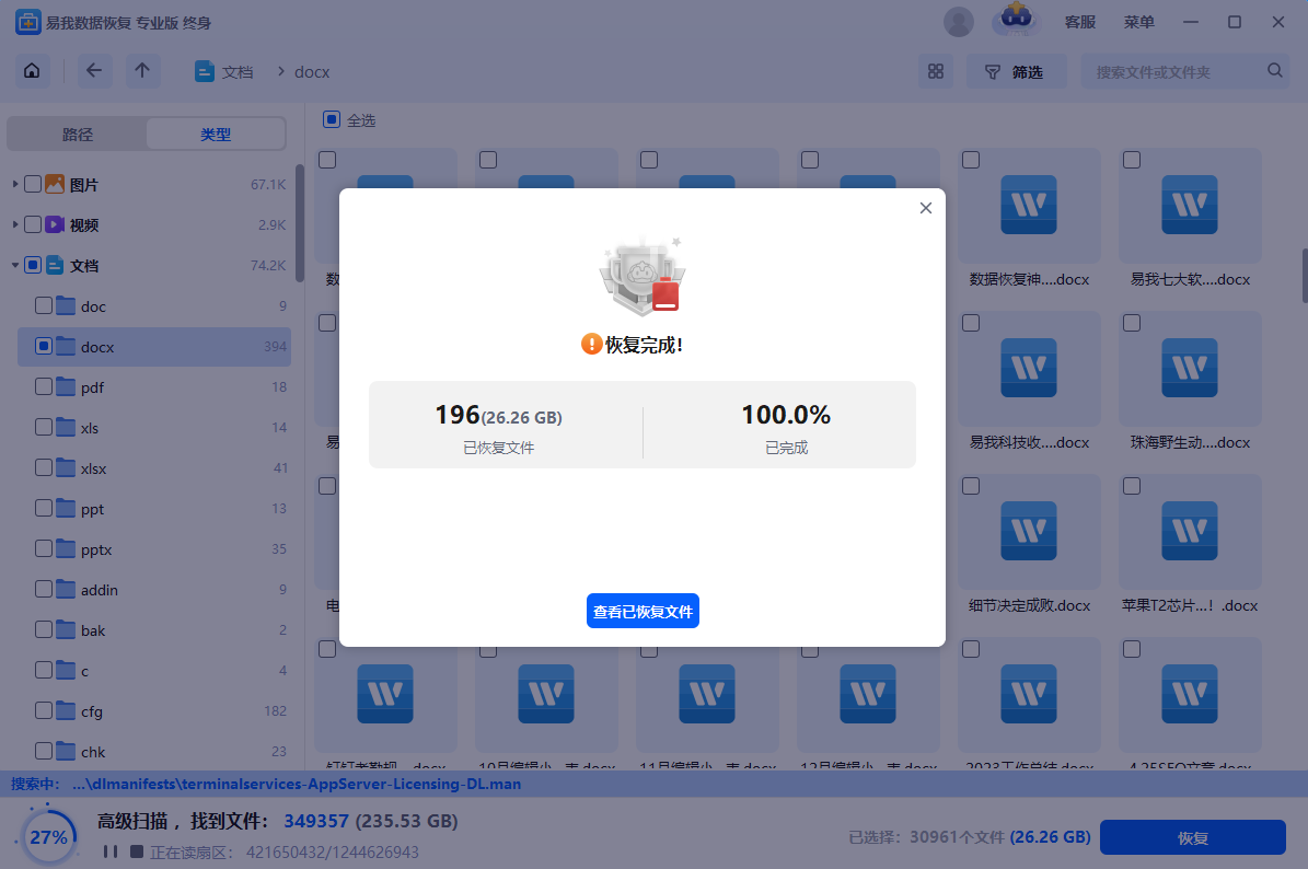 步骤5.等待保存完成,点击“查看已恢复文件”可以查看恢复的文件是否无误。(如果在操作过程中遇到任何问题,可以直接点击右上方“客服”寻求咨询帮助。)
