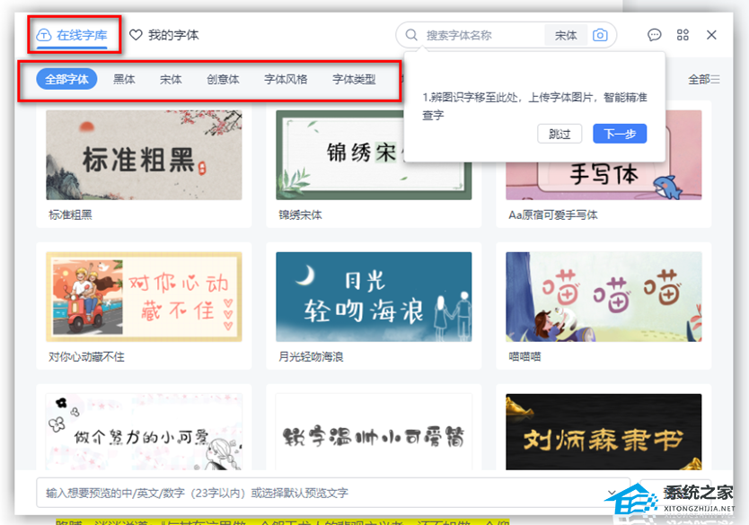 3、接着在页面上弹出设置字体的窗口,在该窗口中你可以看到在线字体和我的字体选项卡,这里我们在【在线字体】中进行操作即可。