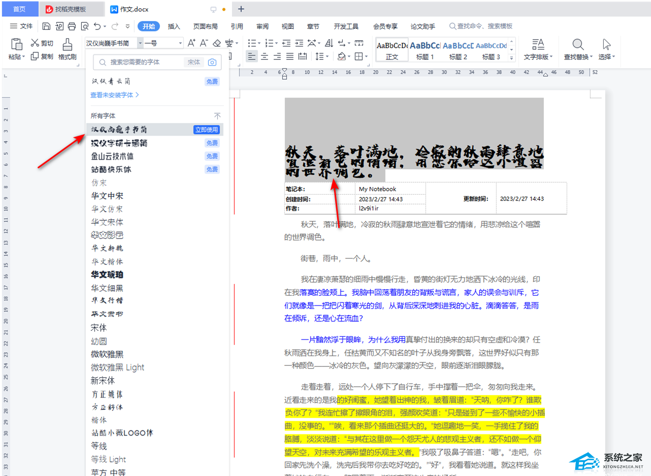7、这时你将自己想要设置字体的文字选中,然后在字体的筛选框中选择刚刚下载的字体就好了,如图所示。
