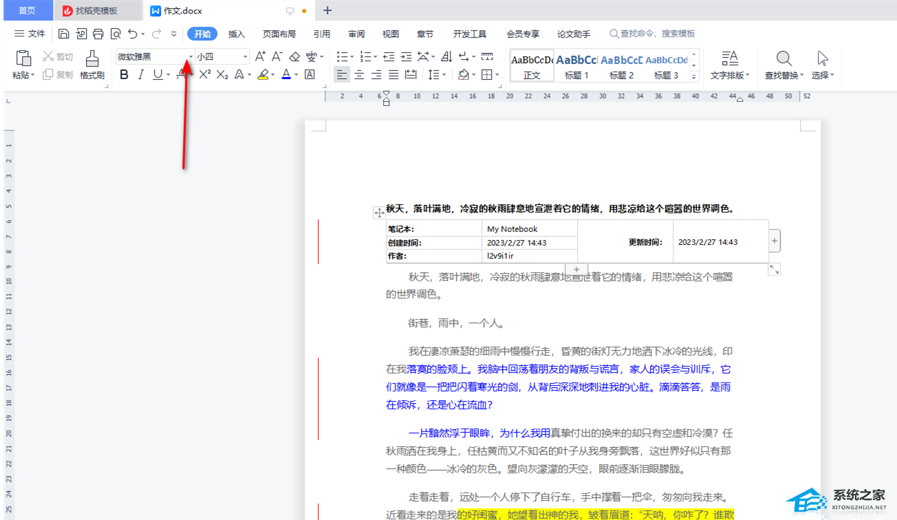 1、当我们将文档点击打开之后,我们需要将鼠标移动到设置【字体】的位置,将字体的下拉按钮进行点击打开。