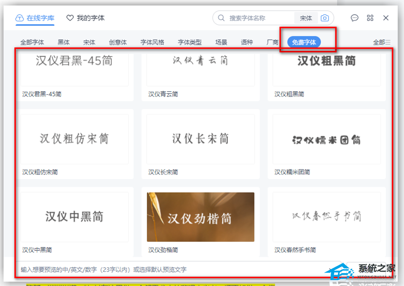 4、在【在线字体】选项卡下,有【免费字体】可以下载,如果你不是会员的情况下可以通过下载免费字体,且免费字体的类型样式也是蛮多的。
