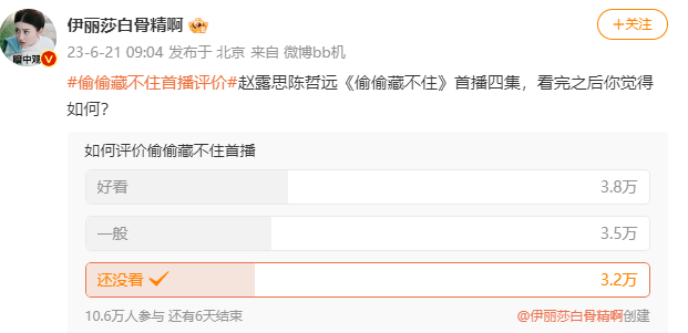 截止目前#偷偷藏不住首播评价#话题讨论度已达到7227.7万的阅读量,目前投票的结果,则是好坏参半,好评略高于差评: