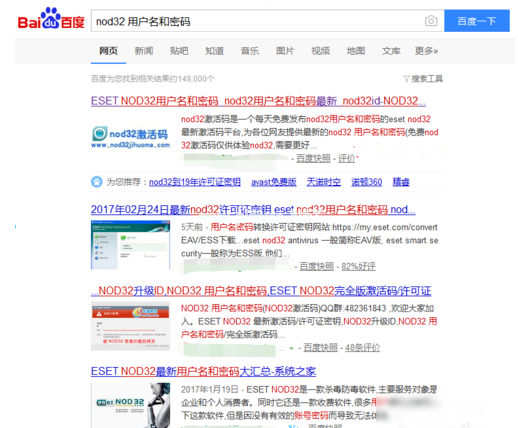 2、可以先自行百度查找一个nod32的用户名和密码,找到更新最近时间的。