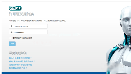 3、将许可证凭证转换到的nod32用户名和密码信息,随后填写【许可证凭据转换】,输入用户名和密码。