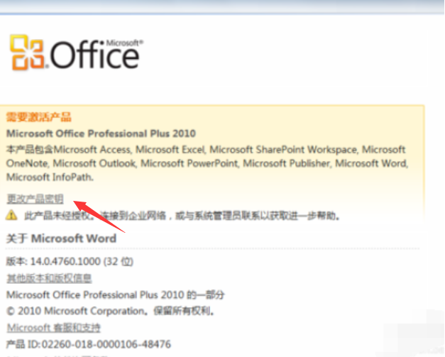 3、点击更改产品密钥选项,然后输入相关的密钥信息激活office2010即可。