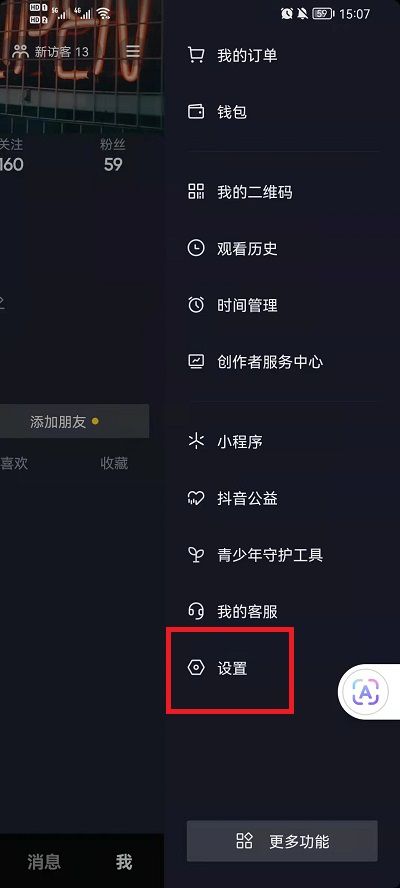 2、点击后就会在界面右边弹出半面弹窗,会有很多功能,我们需要点击最下方的【设置】进入到其界面中;