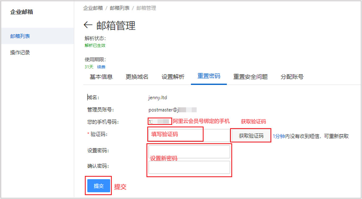 2、登录邮箱控制台进入邮箱管理列表界面,在邮箱管理列表点击邮箱域名右边的“管理”按钮,点击“重置密码”进行重置。