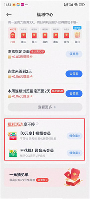 3、可以看到0元享视频会员和音乐会员,点击领会员。