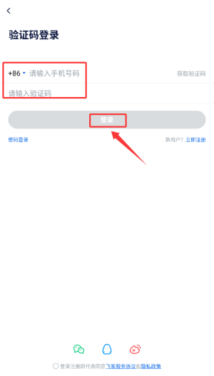 2、选择"登录注册"选项,进入短信验证界面完成账号注册。
