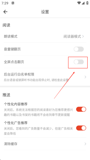 4、勾选“全屏点击翻页”选项,以实现通过全屏点击进行页面翻转的功能。