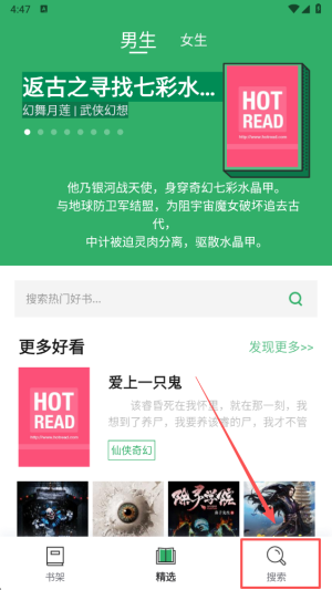 2、选择“搜索”选项,准备探索各种书籍,为您的阅读增添乐趣。