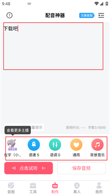 3、输入文本内容开始配音,可以对语速、语调等进行调节。