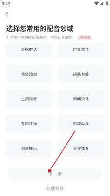1、第一次使用软件需要选择您使用配音的目的然后点击下一步。