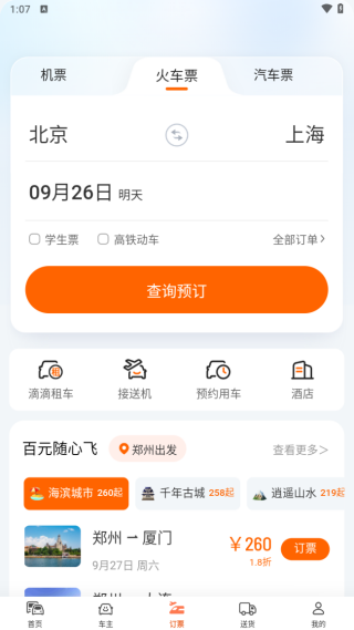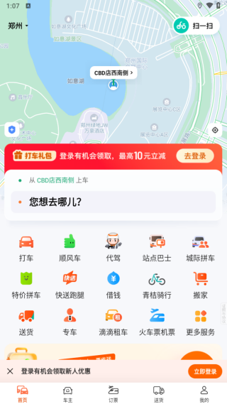 2、进入软件首页,涵盖打车、顺风车、代驾等诸多服务功能。