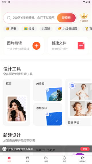 2、在首页可以选择这里功能使用,也可以在上方进行模版搜索,还提供全能设计工具。