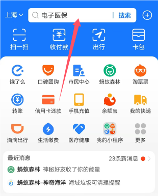 1、首先需要登录支付宝,然后在顶部搜索电子社保卡。