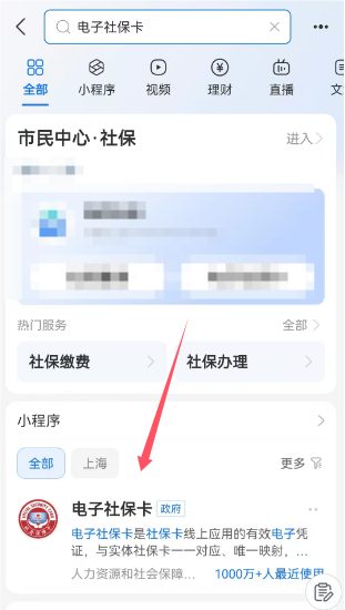 2、在搜索结果中,找到下图的电子社保卡小程序,点击进入。
