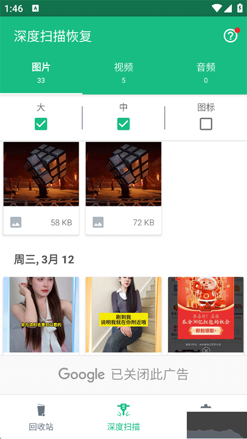 1、打开Dumpster回收站后会自动开始对手机进行深度扫描,扫描完成之后,图片、视频、音频,都能先预览一遍,再决定是否恢复。