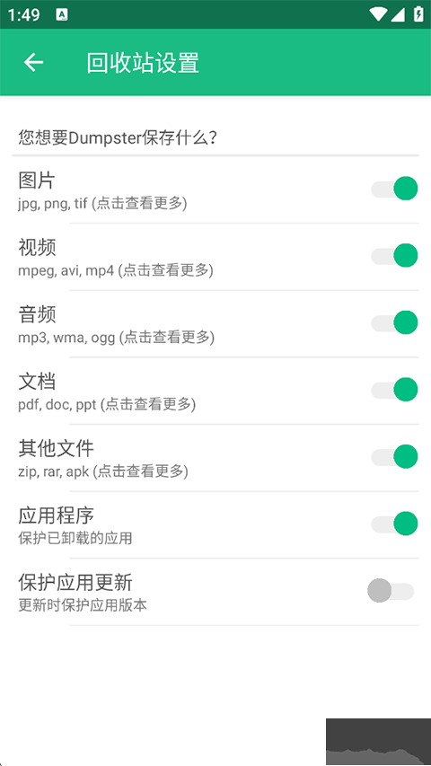 Dumpster回收站app是一款专业的文件恢复软件,界面设计简洁,没有广告,不需要root,工作方式和PC电脑上的回收站类似,功能十分强大。不小心删除了重要图片等文件,软件可以进行文件恢复,支持多种恢复算法,操作简单易用,恢复成功率也很高。还提供可靠的设备备份功能,可以把删除的图片、文件和视频备份到云端,不会占用设备的任何存储空间。非常的实用,需要的朋友快来下载试试吧!