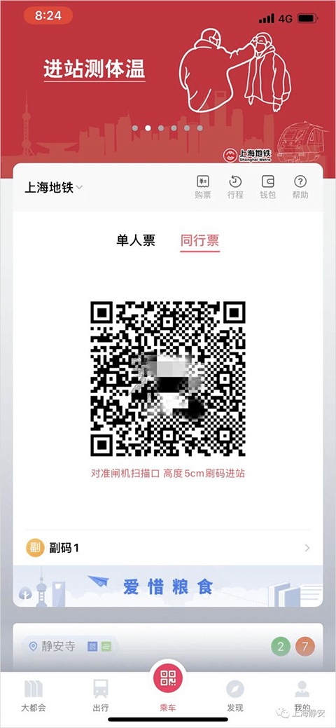 进入乘车页,将二维码切换由“单人票”切换为“同行票”。