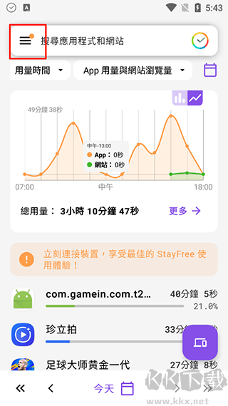 StayFreeapp是一款手机屏幕管理和追踪软件,可以记录用户的手机应用使用历史,通过图表和统计数据,清晰的了解自身使用习惯,还可以选择将这些数据导出为CSV或Microsoft Excel文件。还具备过度使用提醒、界面自定义、导出模式、屏蔽模式、锁定模式、小工具等多种功能,帮助用户更好地规划生活作息与使用习惯。需要的朋友快来下载试试吧!