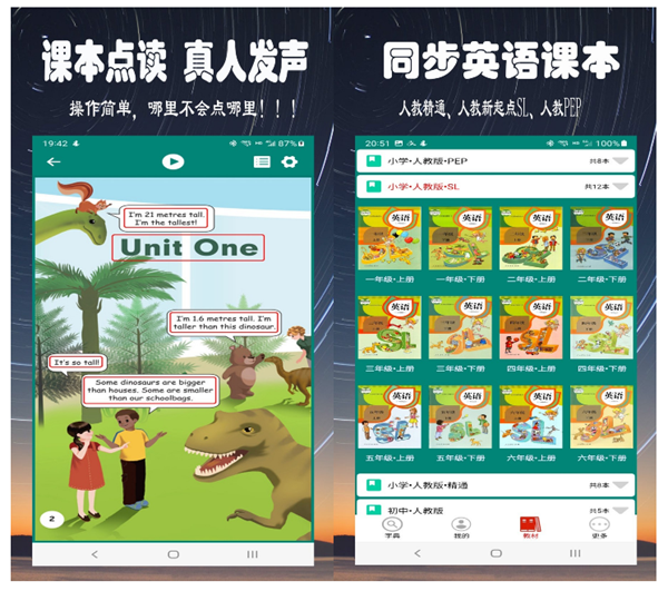 同样是一款强大的英语课本点读软件,这款工具主要面向的还是人教版的课本,而且教材十分齐全,囊括了小学到高中阶段,供我们免费下载和跟读。软件的操作也是比较简单的,进入点读模式之后只需要点击文中对应的位置就可以自动播放相关录音,真人的发声更加准确。还带有丰富的听写、跟读测试,全方位提升英语的水平。