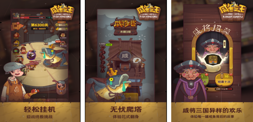 咸鱼之王使用的是非常流行的三国题材,但是在角色的设定,上把这些三国英雄都变成了外观设定各不相同的咸鱼,每个玩家都可以操控这些咸鱼指挥官展开一场对战,每一次战斗采用的都是回合制的模式,需要不断去收集资源,这样才能提高这些咸鱼角色的能力,另外里面还会有竞技场或者是排位战模式,能和其他的成员一起联合起来,共同争夺最终的胜利。
